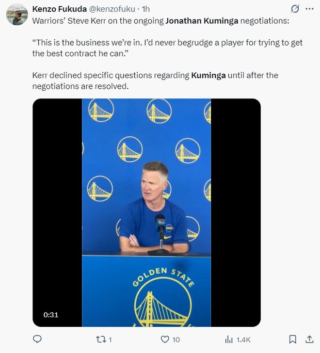 对此NBA记者埃文-斯迪瑞写道:库明加与勇士签下两年4850万含有球队选项的合同,那么他的合同在本赛季会成为勇士队可利用的一大交易筹码。